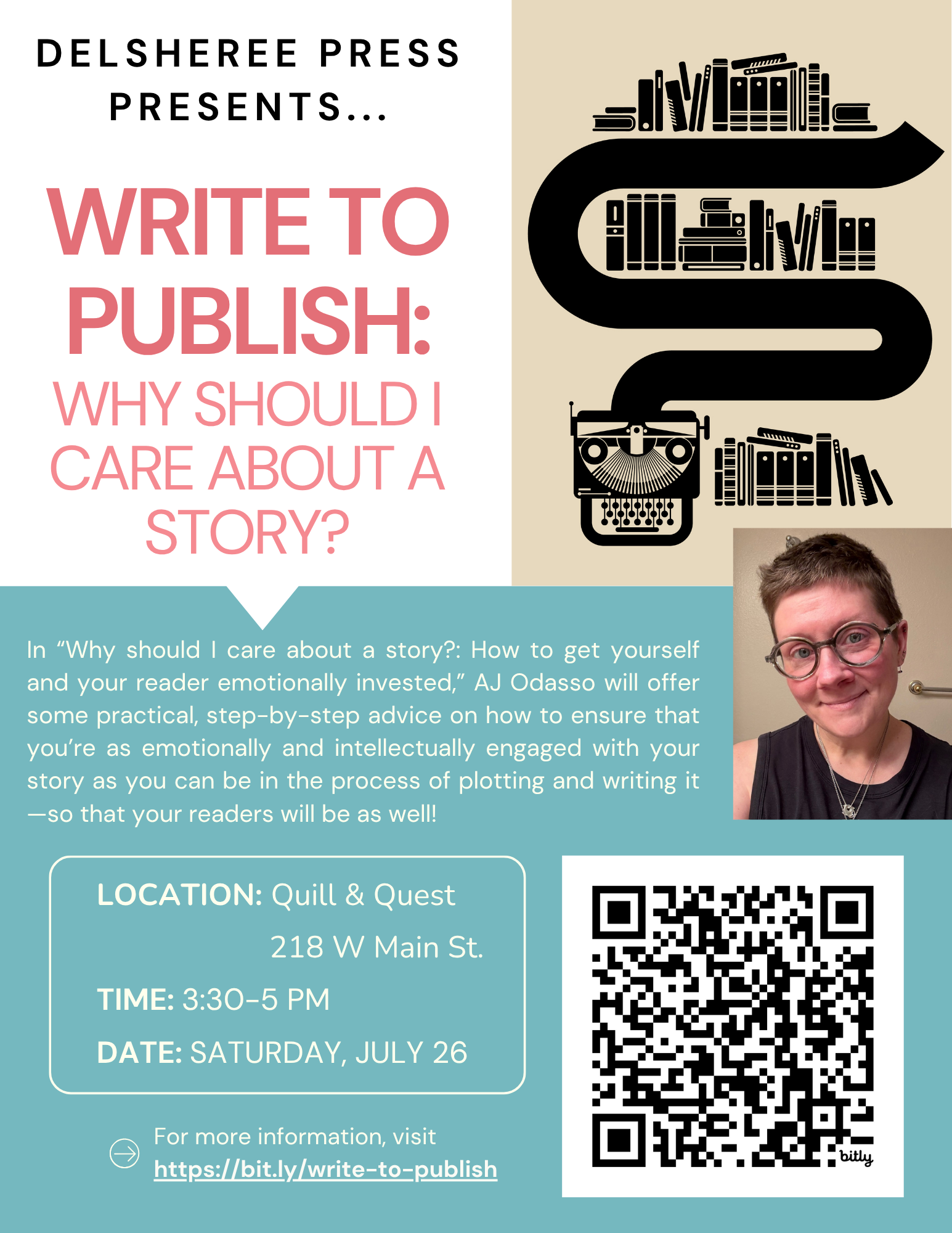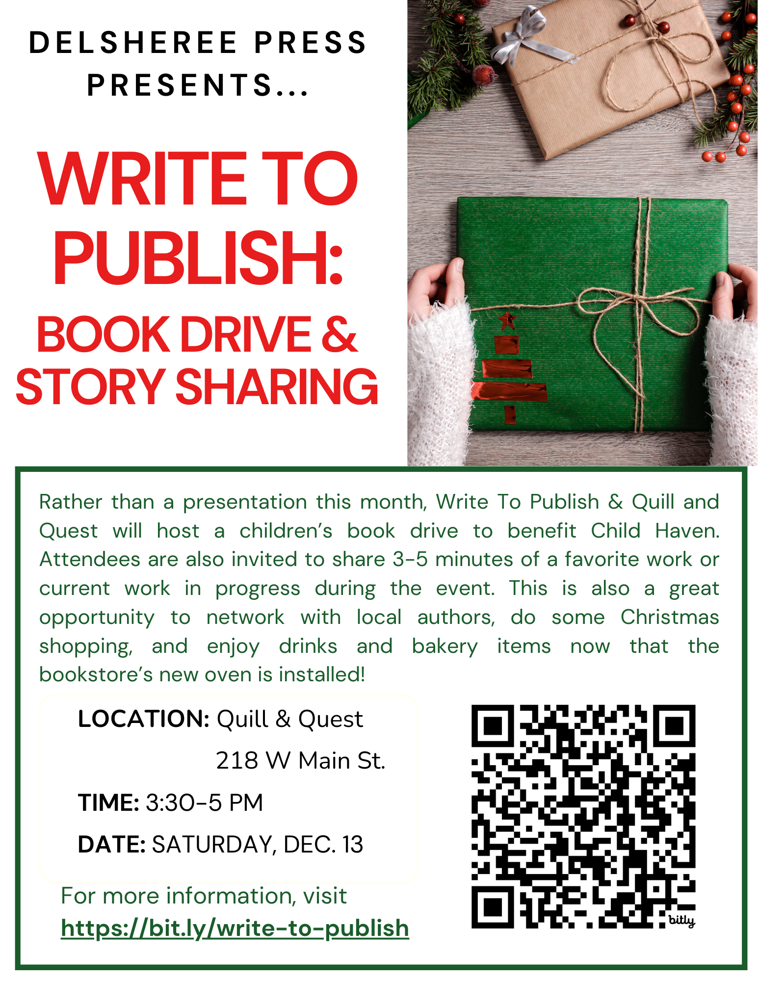 Author presentations are held at a local independent bookstore, Quill & Quest, once per month, usually from 3:30-5 pm on the 3rd or 4th Saturday. Writers of all ages, ability levels, and genre interests are welcome to attend. For specific times and dates, visit the Write to Publish Facebook page, check the blog, or subscribe to the newsletter.